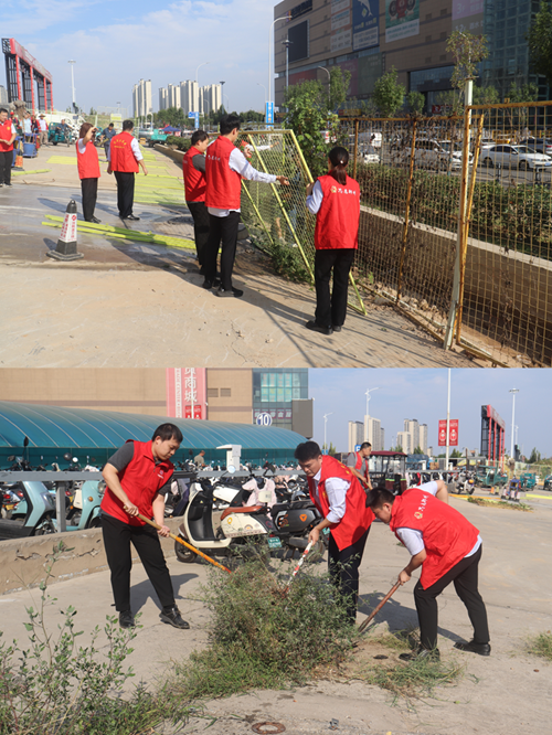 9月24日,新商城運(yùn)營(yíng)公司黨支部組織開(kāi)展“環(huán)境衛(wèi)生整治”主題黨日活動(dòng),弘揚(yáng)“奉獻(xiàn)、友愛(ài)、互助、進(jìn)步”的志愿精神?;顒?dòng)中,黨員志愿者身著紅馬甲,協(xié)作拆除商城外圍陳舊圍擋,清理地面雜草垃圾,并拿起水管,給周邊綠化帶中的植物澆水,草叢在灌溉下愈顯生機(jī)。